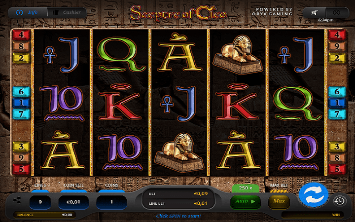 A hajde da vidimo koji su to simboli na kolonama video slota Sceptre of Cleo kao i njihove funkcije i vrijednosti, odmah na smaom početku možemo reći da će scatter simbol omogućiti besplatne spinove, kao i sjajnu dodatnu zaradu. Osim toga simbol koji će vam donijeti najveće isplate jeste sama Kleopatra, tu su i Horusovo oko, sfinge i piramide, kao i klasični kartaški simboli.