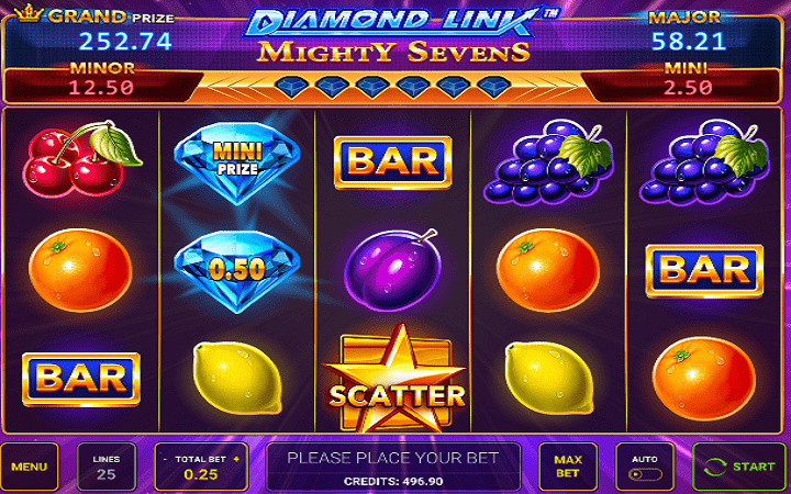Diamond Link Mighty Sevens je slot koji ima pet kolona u tri reda i ima 25 isplatnih linija. Isplatne linije su fiksne i njihov broj ne možete mijenjati. Simboli visoke isplatne moći donijeće vam isplatu i za dva simbola u dobitnom nizu, dok ostali donose isplatu tek za tri simbola u dobitnom nizu. Klikom na tastere plus i minus pored tastera total bet možete postaviti vaše uloge. Autoplay funkcija je dostupna i možete je aktivirati u bilo kom trenutku. Taster Max Bet dopašće se igračima koji vole visoke uloge.