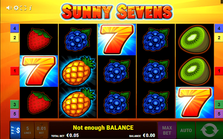 Sunny Sevens je klasičan slot koji vam neće donijeti ni scatter-e ni bonus simbole. Ekskluzivni bonusi nisu nešto što odlikuje ovu igru. Simbol jagode donijeće vam isplatu i sa dva simbola na isplatnoj liniji. Mi ćemo početi sa simbolima najmanje isplatne moći. U pitanju su tri voćkice: banana, grožđe i jagode. Sledeću grupu simbola po isplatnoj moći predstavljaju dvije egzotične voćkice. U pitanju su kokos i kivi. Pet ananasa u dobitnoj kombinaciji donosi 500 puta više od uloga! Iskoristite šansu i dođite do sjajne zarade!