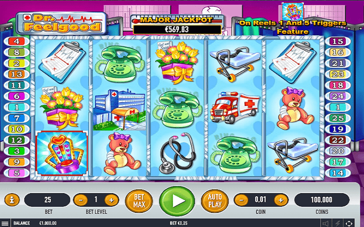 Dr Feelgood je pva slot igra koja se našla na našem članku Ulogom doktora do bonusa i dobitaka, a predstavio nam je proizvođač online kazino igara Habanero. Ovaj online casino slot nam dolazi sa 15 aktivnih polja za igru i 25 fiksnih isplatnih linija, i smješten je u doktorskoj ordinaciji. Broj linija ne možete podešavati, što znači da uloge polažete na svih 25 isplatnih linija.